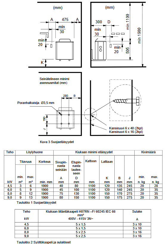 Kiukaan teho / saunan tilavuus: