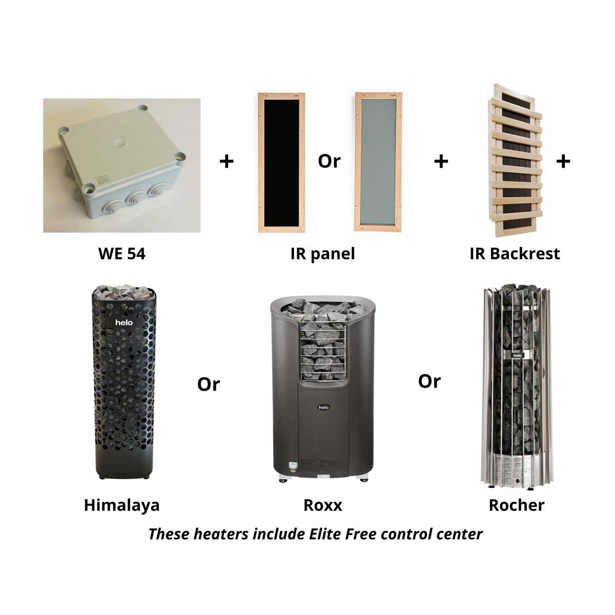 Kotioloissa voit nauttia infrapunasaunasta hankkimalla tämän WE54-kontaktoriboksin, sekä haluamasi väriset infrapaneelit ja Rocher-, Himalaya- tai Roxx-sähkökiukaan, johon sisältyy Elite Free -ohjauspaneeli.
