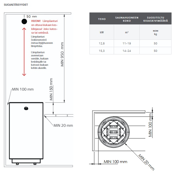 suojaetäisyydet pienenä. Kiuas on helppo integroida lauteisiin, sillä se
